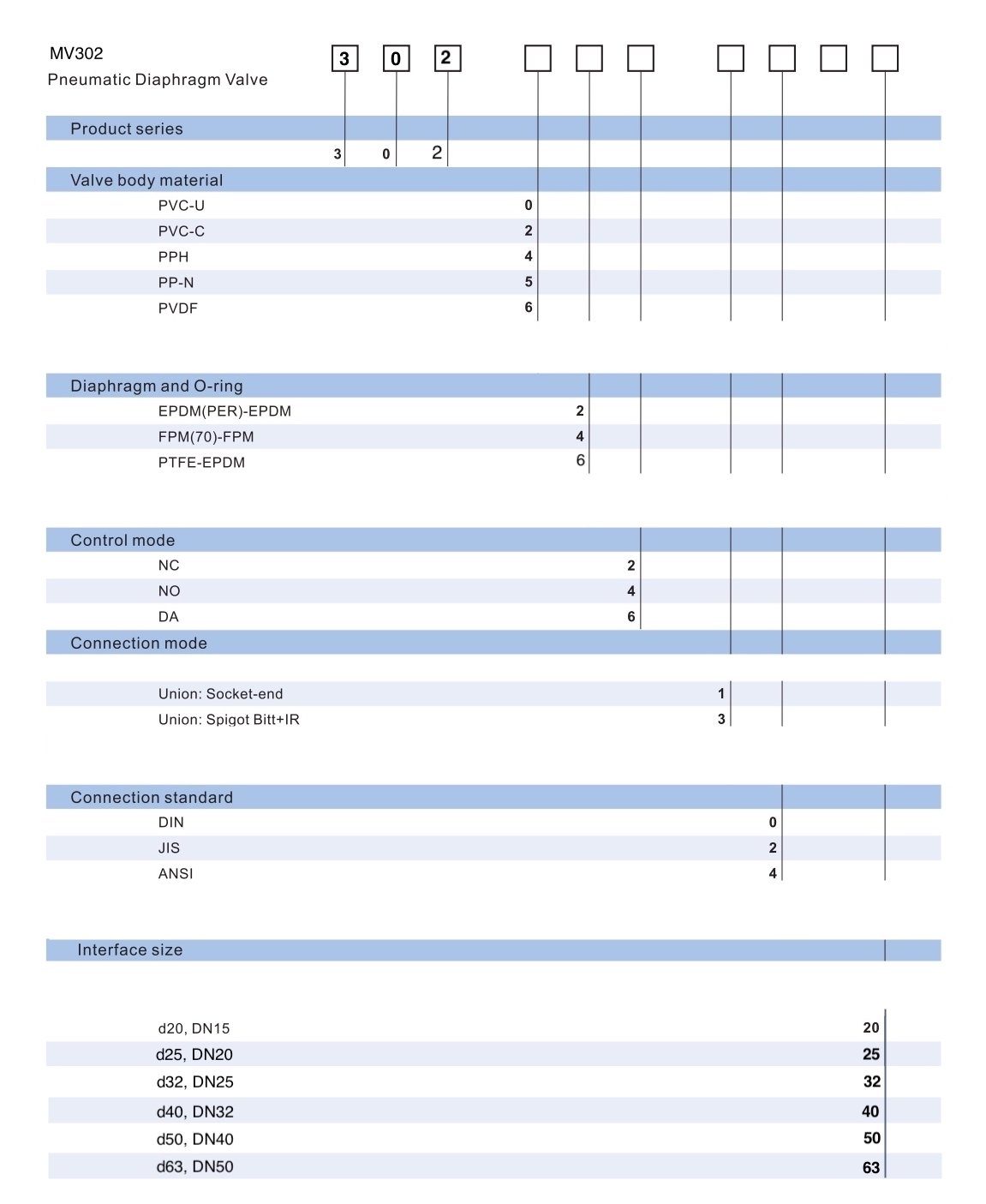 - Valve body materials: PVC-U, PVC-C, PP-H, PP-Natural, PVDF.