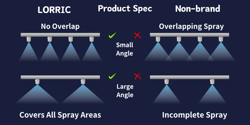 Whether large or small flow, LORRIC nozzles ensure stable spraying without bursts or uneven patterns, contrasting with generic brands where large flows might burst and small flows diverge, leading to inconsistent performance.