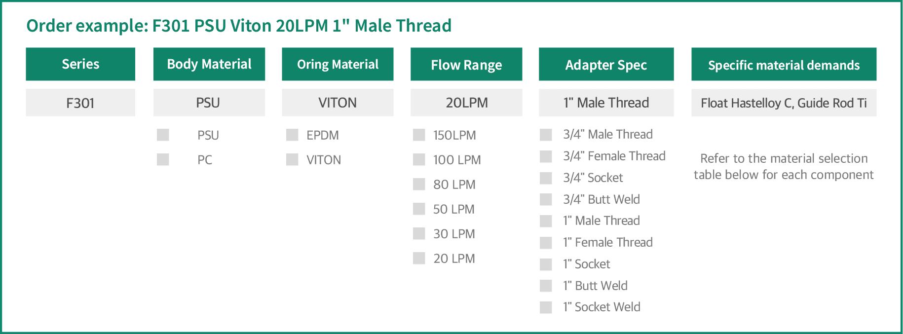 The flow meter body is available in two materials: transparent PC (Polycarbonate) for tap water, and light yellow PSU (Polysulfone), which is acid, alkali, and electrolyte resistant, suitable for chemicals like sulfuric acid and sodium hydroxide, etc.