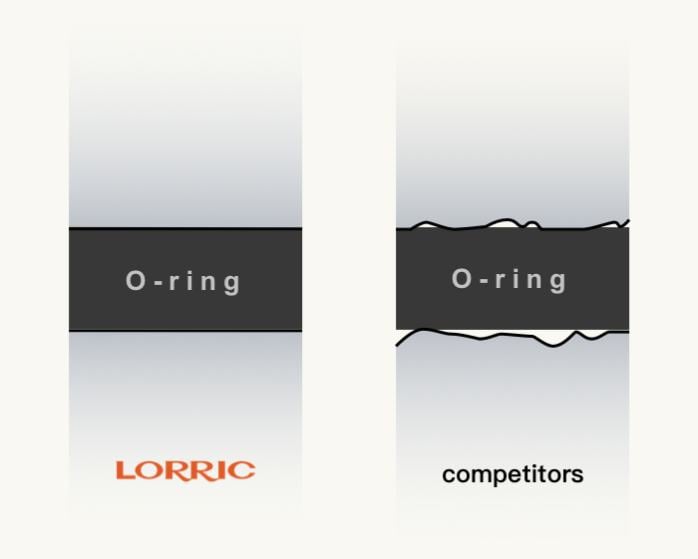 Most market-available fittings are injection molded, leading to wavy surfaces due to cooling shrinkage. LORRIC uniquely produces fittings by turning, resulting in a smooth surface without depressions, paired with an Oring seal for a worry-free, leak-proof experience.