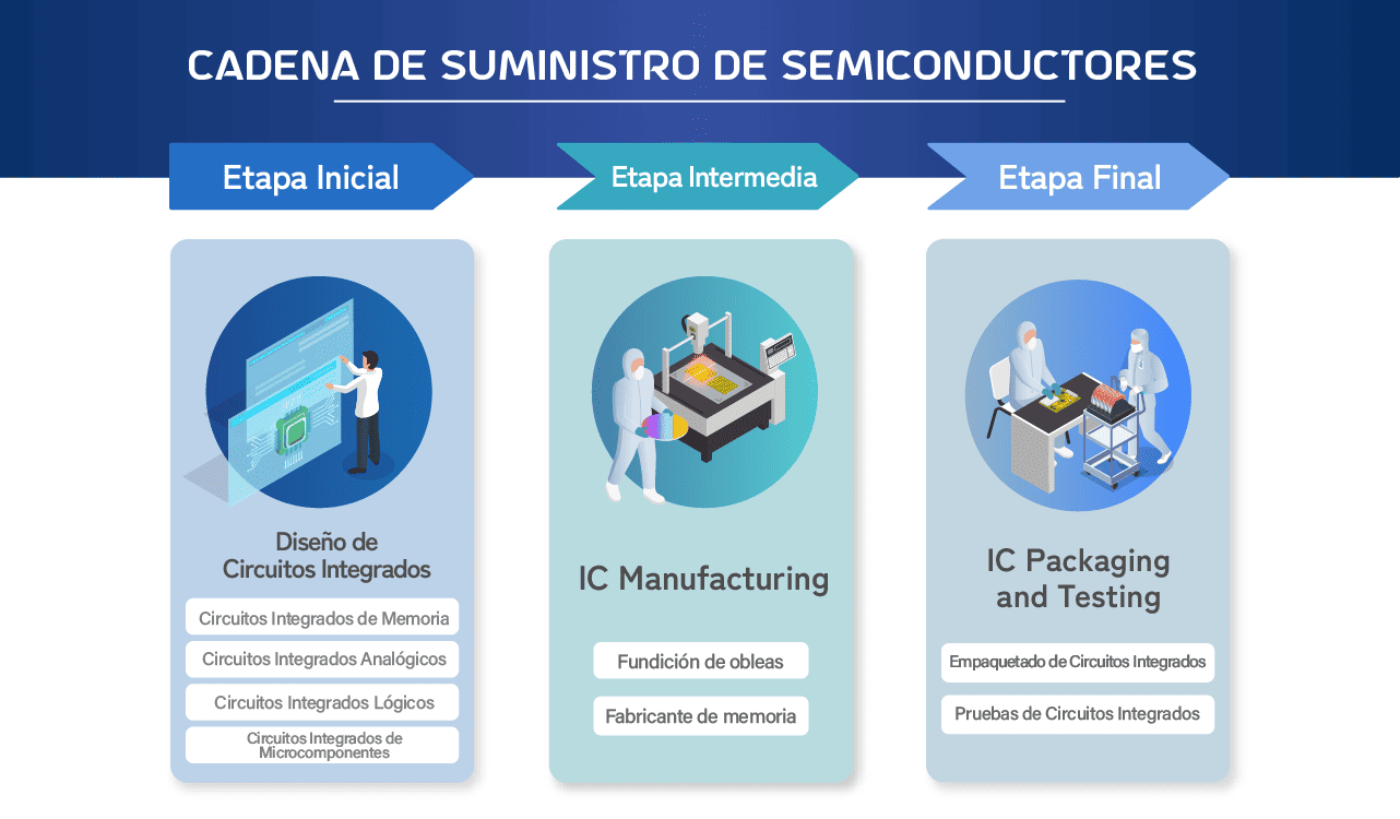 La cadena de la industria de semiconductores se puede dividir en tres segmentos: diseño de circuitos integrados (IC), fabricación de IC y empaquetado y pruebas de IC.