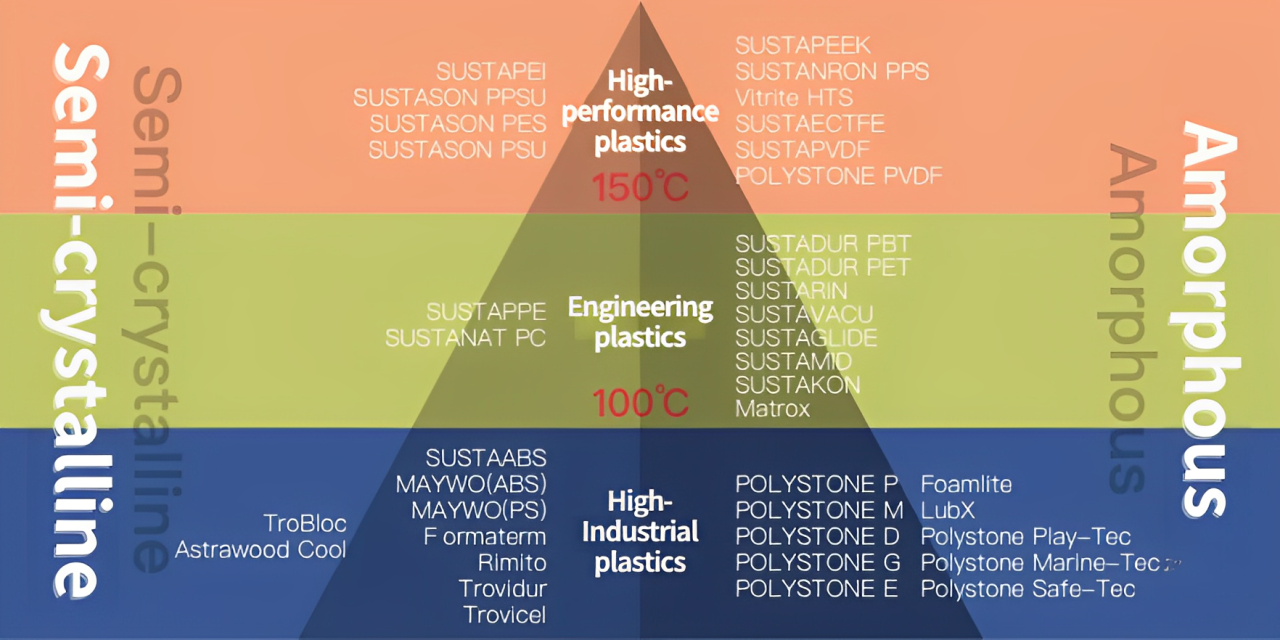 このチャートは、Röchlingの材料を耐熱性で分類しており、製品の命名規則に関する記事と併せて使用することで、製品モデルと対応する材料を一致させるための参考になります。