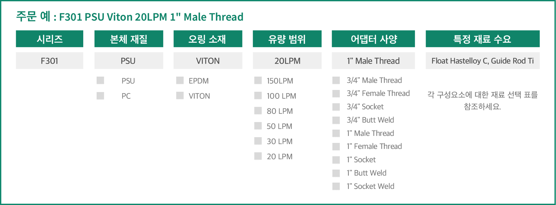 유량계 본체는 두 가지 재질로 제공됩니다: 수도용에 적합한 투명한 PC (폴리카보네이트)와, 황색의 PSU (폴리설폰), 이는 산, 알칼리, 전해질에 내성이 있어 황산 및 수산화나트륨 등과 같은 화학물질에 적합합니다.