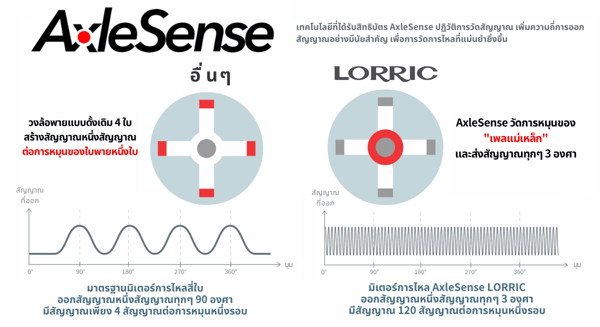 เทคโนโลยีที่จดสิทธิบัตร AxleSense ช่วยให้สามารถ ตรวจจับการไหลของของเหลวได้สองทิศทาง โดยการวัดทิศทางการหมุนของใบพัด ซึ่งแตกต่างจาก เซ็นเซอร์ Hall Effect ของแบรนด์อื่นที่สามารถตรวจจับการหมุนได้ แต่ ไม่สามารถระบุทิศทางการไหลของของเหลว ด้วยเทคโนโลยีนี้ ผู้ใช้งานจะได้รับข้อมูลเกี่ยวกับ ทิศทางการไหลของของเหลว รวมถึงการคำนวณ อัตราการไหลบวก/ลบ และปริมาณการไหลสุทธิ พร้อมทั้ง บันทึกประวัติการสะสมรายวันย้อนหลัง 14 วัน เพื่อช่วย เพิ่มประสิทธิภาพในการดำเนินงาน และ ยกระดับการจัดการในสถานที่ได้อย่างมีประสิทธิภาพ