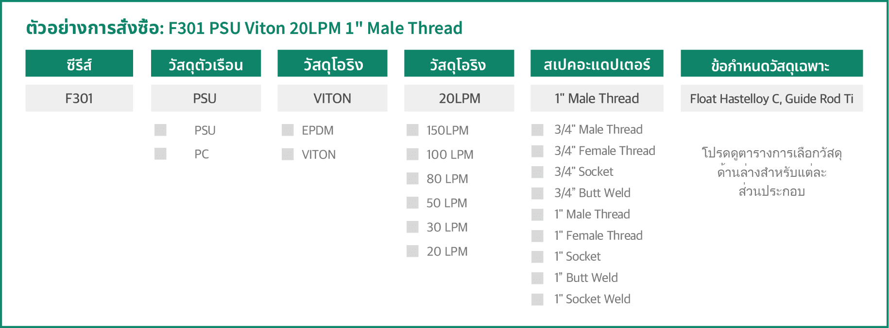 ตัวเครื่องของมิเตอร์การไหลมีให้เลือกสองวัสดุ: พลาสติกใส PC (Polycarbonate) สำหรับน้ำประปา และพลาสติกสีเหลืองอ่อน PSU (Polysulfone) ซึ่งทนกรด, ด่าง, และอิเล็กโทรไลต์ได้ เหมาะสำหรับสารเคมีเช่น กรดซัลฟิวริกและโซเดียมไฮดรอกไซด์ เป็นต้น
