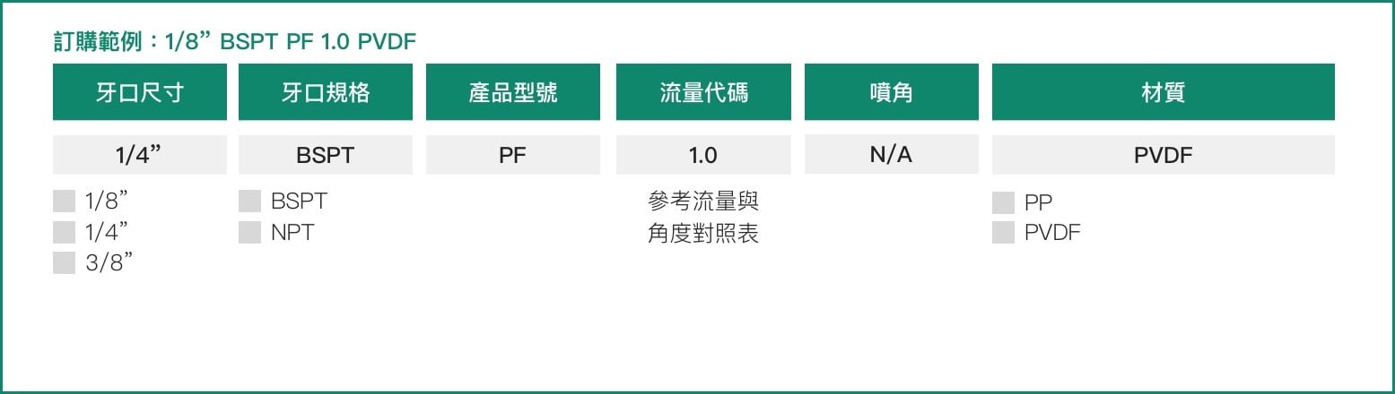 單流體扇形噴嘴,水從噴水口噴出來的噴霧形狀(Spray Pattern)如扇子,因此稱為扇型。覆蓋形狀(Coverage Pattern) 上往下看噴灑標的後形成形狀為單線狀兩側漸縮 (tapered edge)。 了解更多:噴嘴噴霧形狀